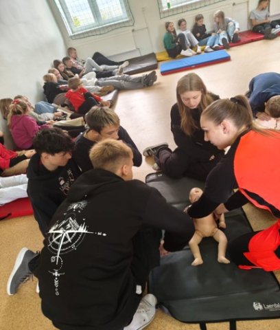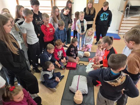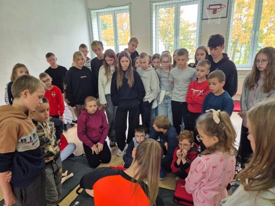 2. Szkolenia z pierwszej pomocy przeprowadzono w okresie 29.09–30.10.2025 r. w dwóch grupach dorosłych po 10 osób, z których każda odbyła 6-godzinne zajęcia (18 i 19 października). Dodatkowo przeszkolono uczniów klas VI–VIII szkoły podstawowej w Żegotach w trzech grupach w dniach 15–17 października 2025 r.
